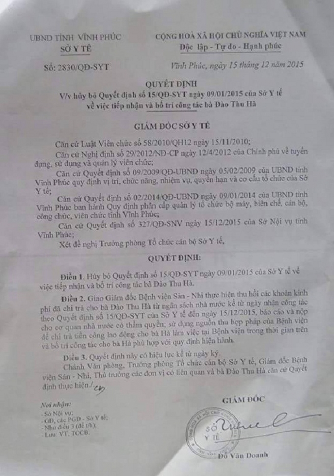 Trong ngày 15/12/2015, trên cơ sở quyết định của Sở Nội vụ Vĩnh Phúc, Sở Y tế Vĩnh Phúc ban hành Quyết định số 2830/QĐ-SYT về việc “Hủy bỏ Quyết định số 15/QĐ-SYT ngày 9/1/2015 của Sở Y tế về việc tiếp nhận và bố trí công tác bà Đào Thu Hà” do ông Đỗ Văn Doanh, Giám đốc sở ký.