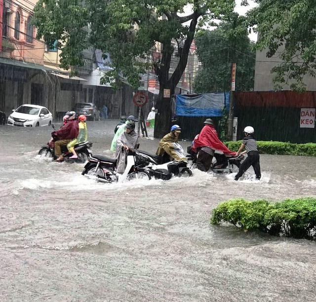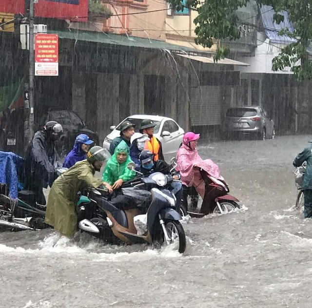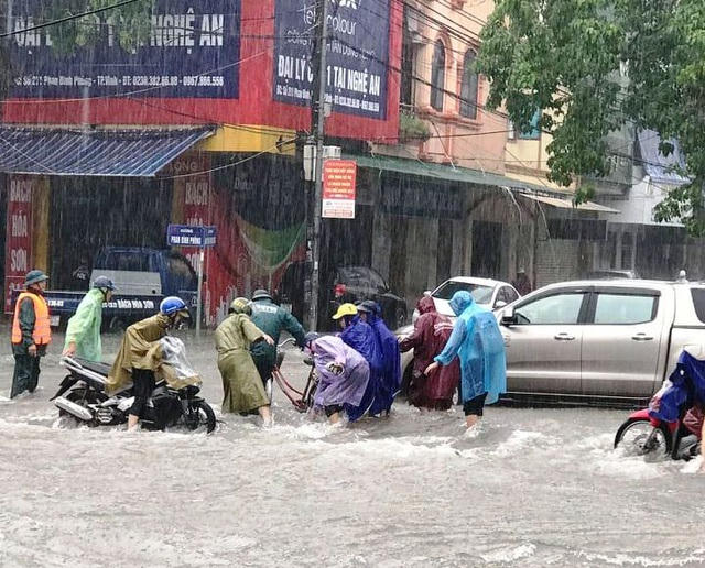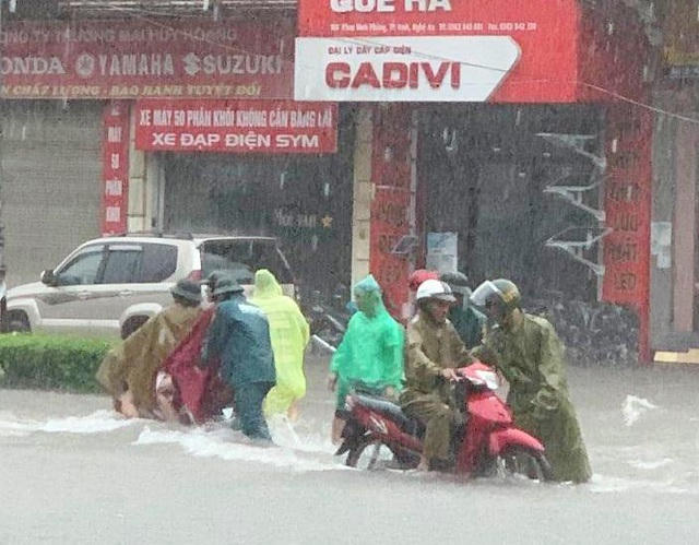 Cơn mưa lớn kéo dài suốt 2 ngày khiến TP Vinh (Nghệ An) “thất thủ”. Sáng 16/10, nhiều tuyến đường ngập sâu trong nước, có những khu vực ngập hơn nửa mét đến gần một mét. Giao thông nhiều nơi gần như bị tê liệt. Trên đường phố, từng dãy xe nối dài do bị ngập nước, chết máy, người dân phải cầu cứu đến lực lượng cứu hộ giao thông.
