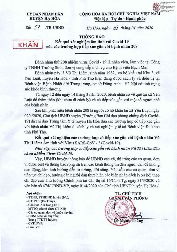 Thông báo số 57 của UBND huyện Hạ Hòa về kết quả xét nghiệm 5 người tiếp xúc gần (thuộc diện F1) đã tiếp xúc với nữ bệnh nhân 208 đều âm tính với Covid 19.