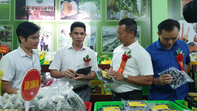Hàng loạt sản phẩm nông nghiệp tiêu biểu huyện Hiệp Hoà được giới thiệu. Ông Hoàng Công Bộ - Chủ tịch UBND huyện Hiệp Hoà (thứ 2 từ trái sang) giới thiệu sản phẩm trám đen tới các quý khách.