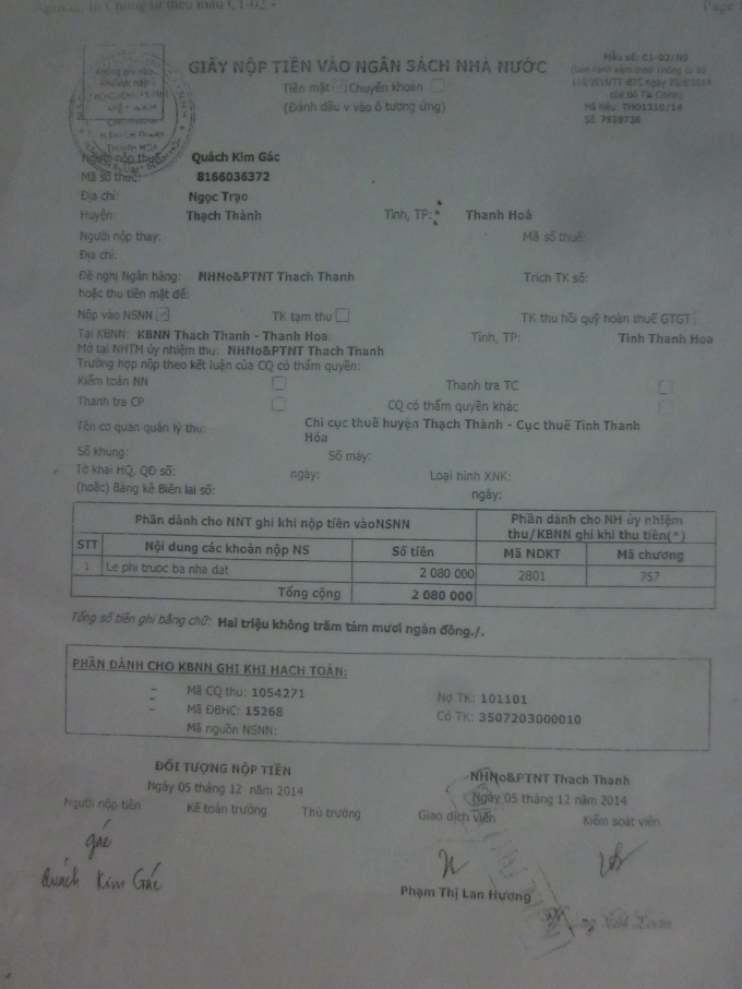 Cũng liên quan đến việc làm sổ đỏ, gia đình ông Qúach Kim Gác đã đóng cho bà Nhung 2.080.000 đồng với lý do phải nộp thuế trước bạ nhà đất.