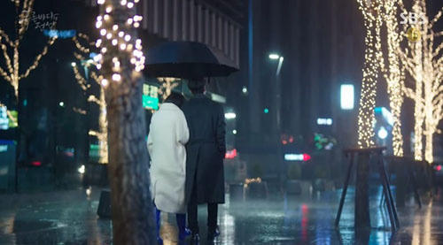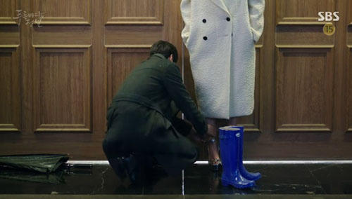 Vừa lúc đó thì trời đổ mưa to, anh chàng Joon Jae đã đi tìm ngay một chiếc dù và đôi ủng. Anh nhẹ nhàng cúi người xuống để giúp Shim Chung thay giày. Sự tận tâm của anh làm cho nàng tiên cá hết sức cảm động.
