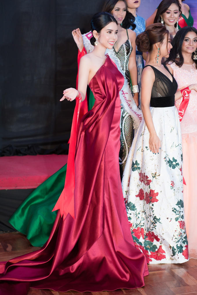 Trước đó, Huỳnh Vy cũng đã bước vào đêm thi Trình diễn trang phục dạ hội - cũng là một phần thi phụ quan trọng trong khuôn khổ Hoa hậu Du lịch Thế giới 2018. Chọn lựa chiếc đầm đỏ rực rỡ, Huỳnh Vy tạo được ấn tượng khi bộ váy khoe trọn những đường cong cơ thể, đồng thời vẫn giúp Huỳnh Vy tự tin sải bước trên sàn diễn.