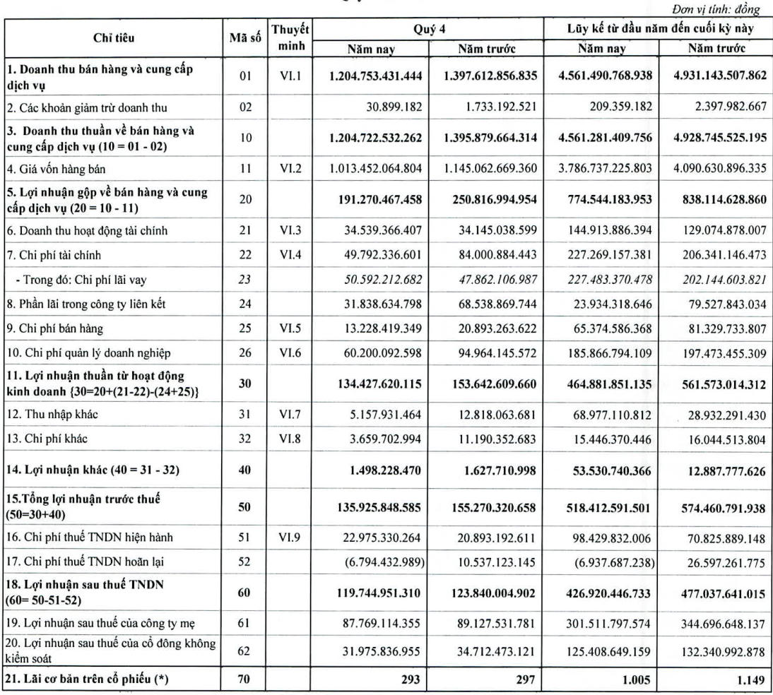 Tổng công ty Idico (Mã CK: IDC) công bố báo cáo KQKD hợp nhất quý 4/2020 với doanh thu thuần 1.205 tỷ đồng, giảm 14% và lợi nhuận sau thuế 119,7 tỷ đồng, giảm 3,3% so với cùng kỳ năm trước. Trong đó, lợi nhuận thuộc về công ty mẹ là 87,8 tỷ đồng, giảm 1,5%.
