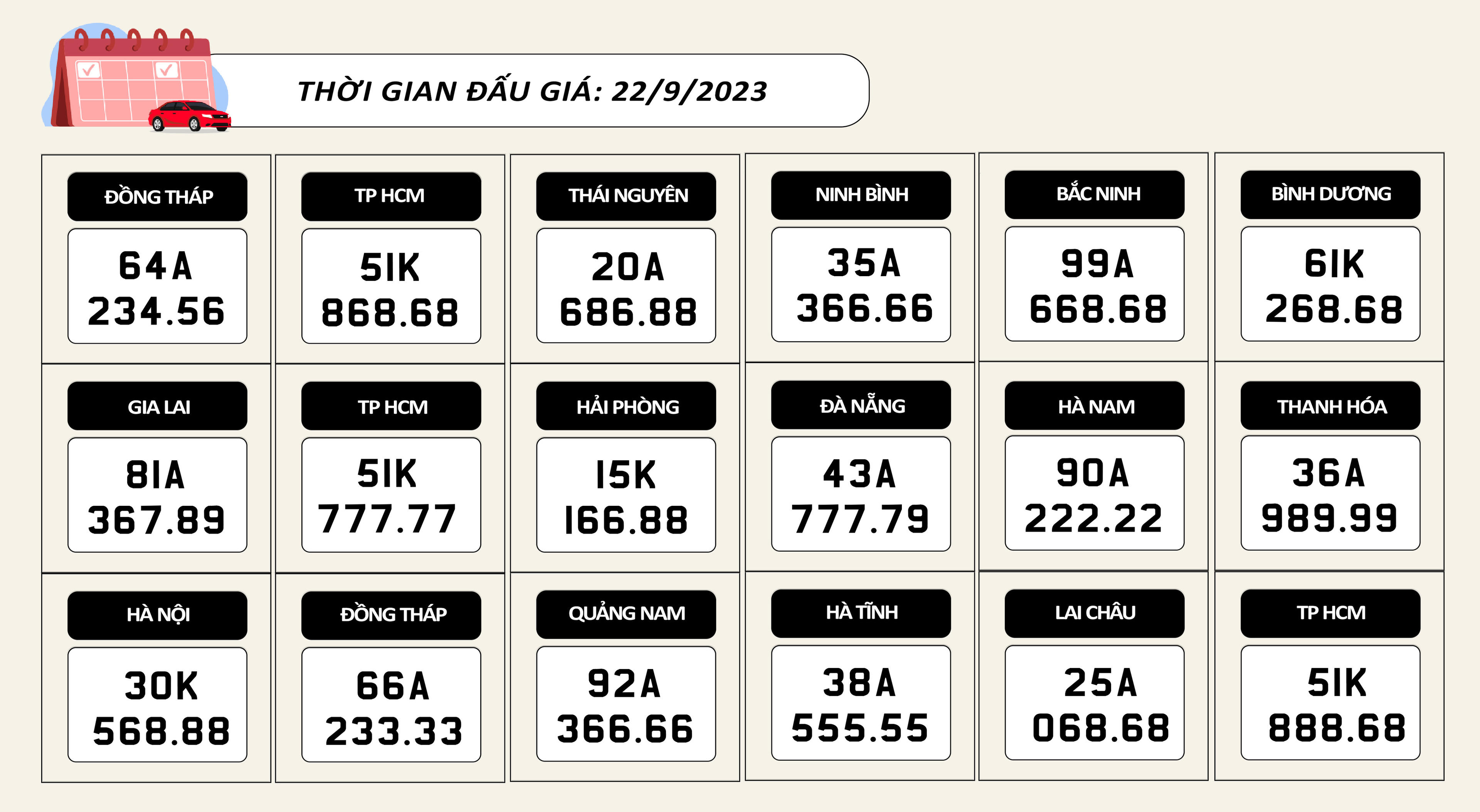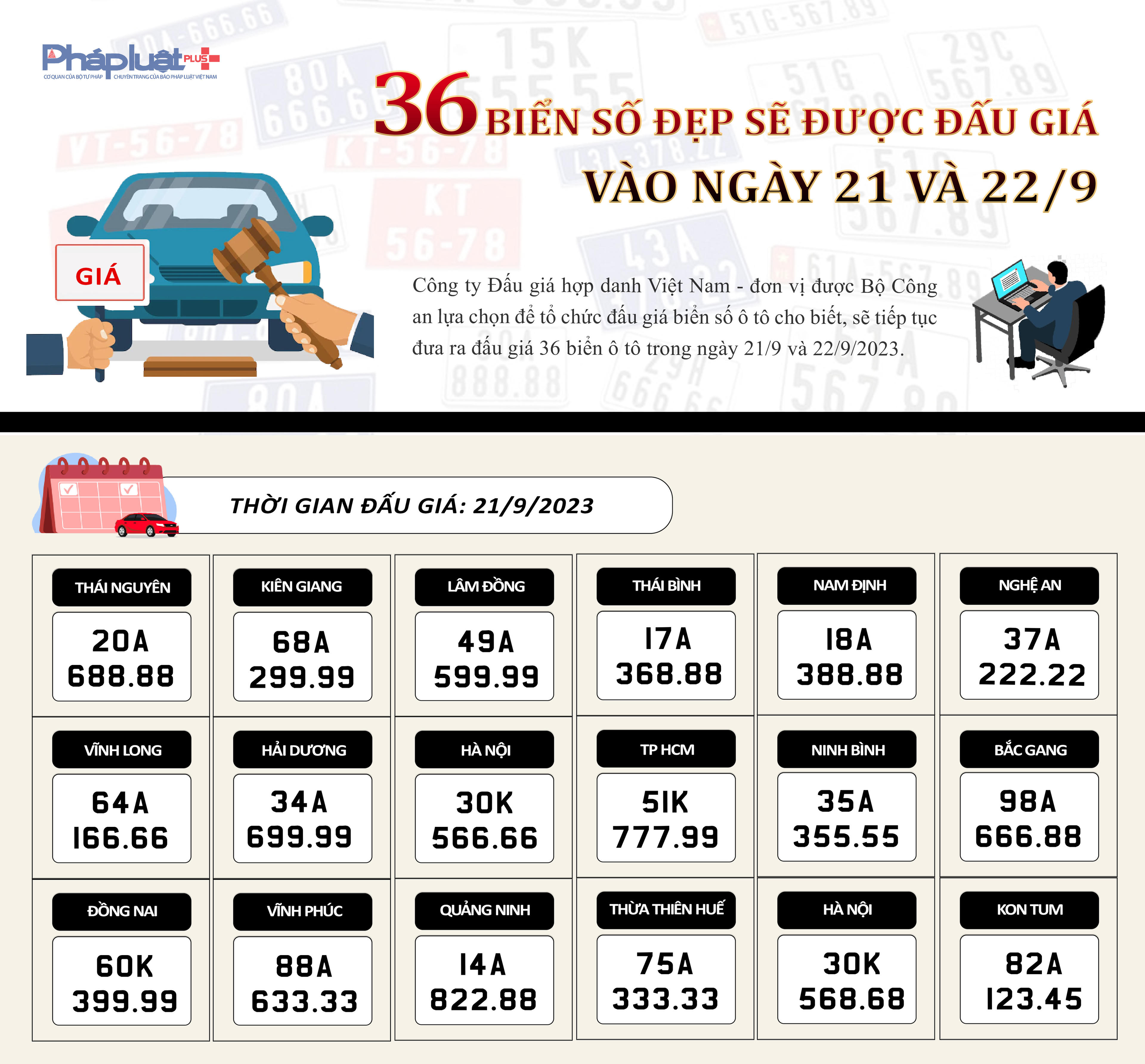 Theo Công ty Đấu giá hợp danh Việt Nam, sẽ có 36 biển số xe ô tô sẽ được đưa ra đấu giá trong ngày 21/9 và 22/9/2023.