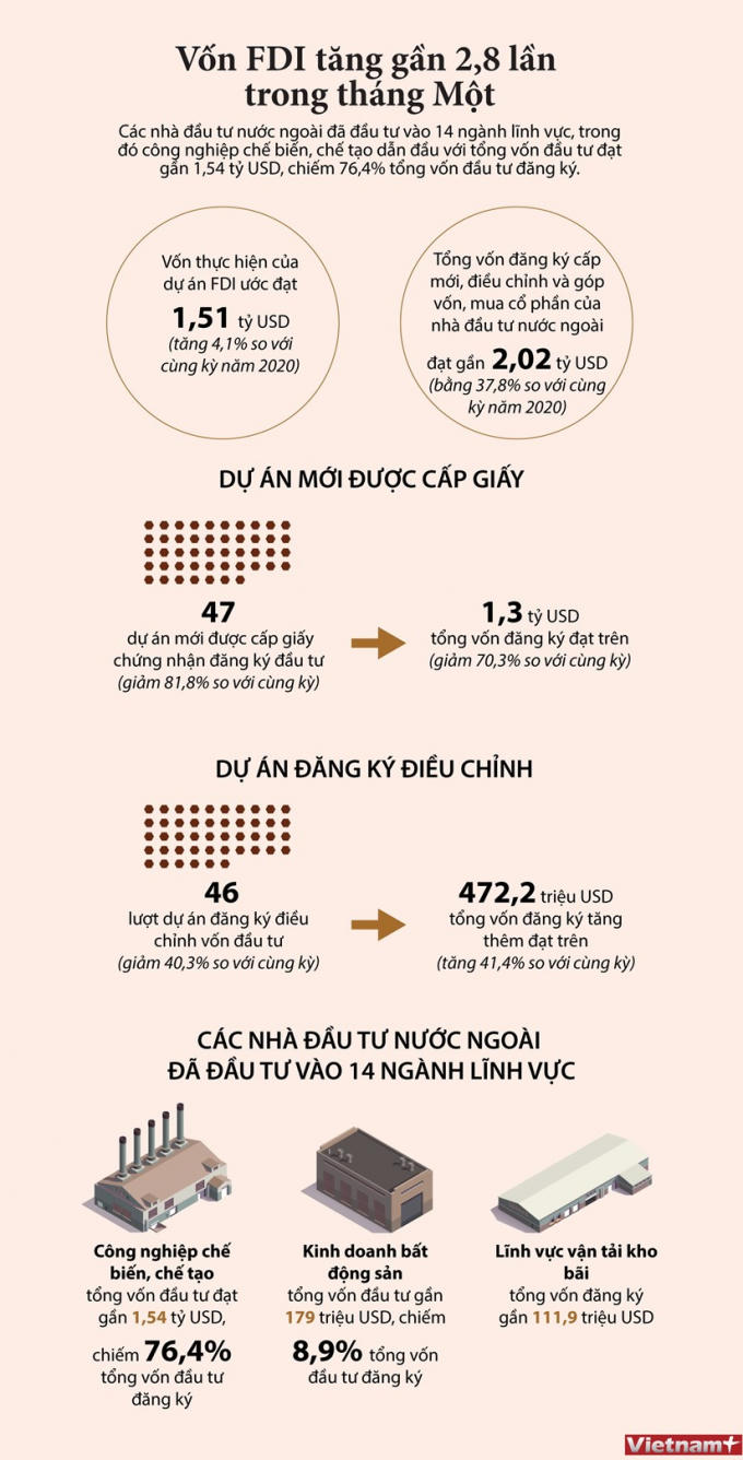 [Infographics] Vốn FDI tăng gần 2,8 lần trong tháng Một