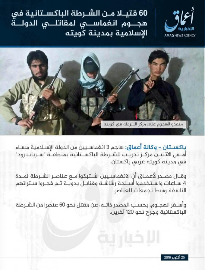 Chiều 25/10, Tổ chức Nhà nước Hồi giáo tự xưng (IS) đã lên tiếng nhận trách nhiệm vụ xả súng đẫm máu vào Học viện cảnh sát Balochistan, Pakistan khiến ít nhất 61 người thiệt mạng và hơn 100 người khác bị thương đêm 24/10.