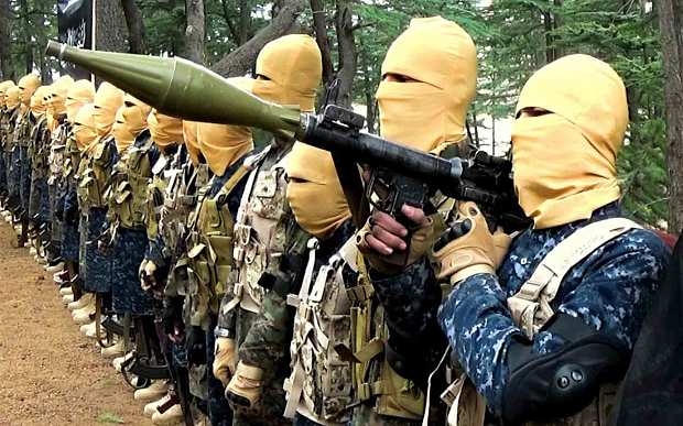 Các bức ảnh cho thấy những kẻ tân binh trùm đầu, bịt kín mặt, cầm súng ngắn và súng phóng lựu đứng dưới lá cờ đen của nhóm Nhà nước Hồi giáo (IS).