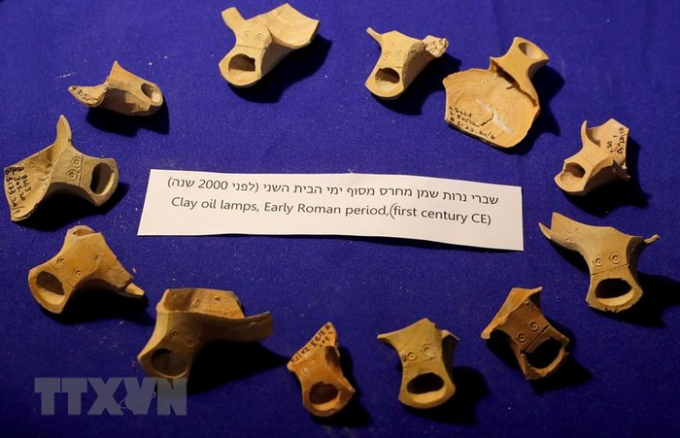 Giới khảo cổ Israel ngày 19/5/2020 cho biết đã phát hiện những căn phòng bí ẩn dưới lòng đất từ một tầng đá nền ở khu vực gần Đền thờ Do Thái thứ hai, được cho là xuất hiện từ đầu thời kỳ La Mã cách đây hai thiên niên kỷ.Trong ảnh: Đèn dầu bằng đất nung được phát hiện bên trong căn phòng cổ dưới lòng đất tại Jerusalem, ngày 19/5/2020. (Ảnh: THX/TTXVN