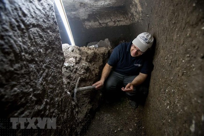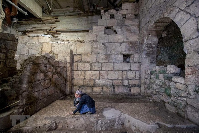 Giới khảo cổ Israel ngày 19/5/2020 cho biết đã phát hiện những căn phòng bí ẩn dưới lòng đất từ một tầng đá nền ở khu vực gần Đền thờ Do Thái thứ hai, được cho là xuất hiện từ đầu thời kỳ La Mã cách đây hai thiên niên kỷ. Trong ảnh: Nhà khảo cổ làm việc bên trong căn phòng cổ mới phát hiện dưới lòng đất tại Jerusalem, ngày 19/5/2020. (Ảnh: THX/TTXVN)
