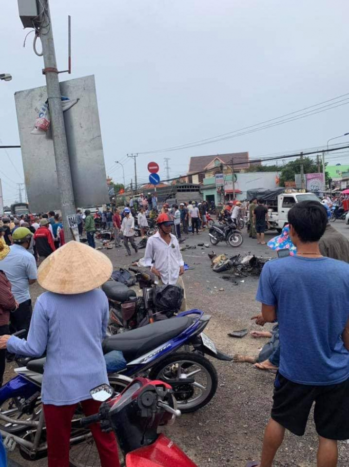 Xe container đã tông vào 18 xe máy chờ đèn đỏ tại ngã tư Bình Nhật, gần cầu Bến Lức khiến 5 người tử vong tại chỗ, 23 người bị thương.