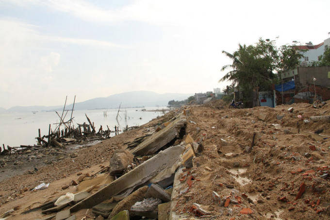Tuy nhiên, sau khi sóng đánh vỡ vụn, nền đất trên thân đê bị xói lở, trôi tuột xuống sông. Trong khi đó, hệ thống mái kè, thân kè có rất ít sắt thép bên trong dẫn tới trọng lực chịu được thấp khiến dầm ngang bờ kè bị sóng đánh gãy nhiều đoạn, chân kè bị xói lở, trôi hết ra sông.