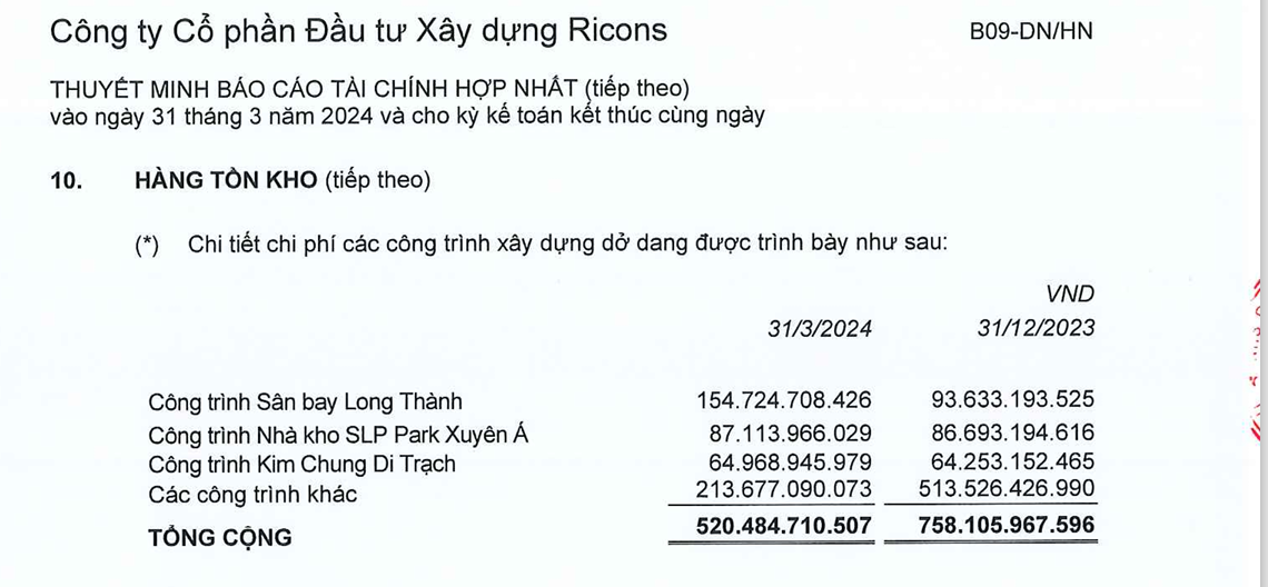 Trong đó, hàng tồn kho trong quý giảm 31% còn 520 tỷ đồng, chiếm 6,9% tổng tài sản, là chi phí xây dựng dở dang tại các dự án: sân bay Long Thành (154 tỷ đồng), Kim Chung – Di Trạch (65 tỷ đồng), nhà kho SLP Park Xuyên Á (87 tỷ đồng).