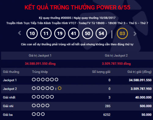 Bộ số may mắn trong kỳ quay thưởng lần này là: 10 – 11 - 19 - 41 – 50 – 54. Trong kỳ quay thưởng thứ 5 của loại hình xổ số Power 6/55, Vietlott cũng không tìm ra khách hàng trúng thưởng giải Jackpot 2 trị giá 3.509.787.950 đồng. Con số may mắn để trúng giải jackpot 2 của xổ số Vietlott là số 03.