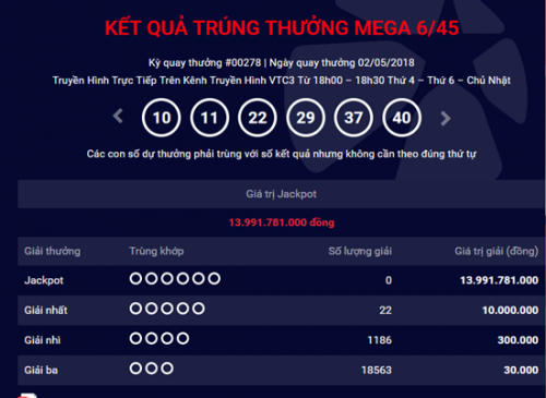 Tại kỳ quay thưởng thứ 278 của xổ số Mega 6/45 mở thưởng ngày 2/5 đã không tìm ra chủ nhân của giải Jackpot trị giá 13.991.781.000 đồng.