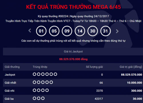 Tại kỳ quay thưởng thứ 224 của xổ số Mega 6/45 mở thưởng ngày 24/12 đã không thể tìm ra chủ nhân của giải Jackpot trị giá 88.529.570.000 đồng.