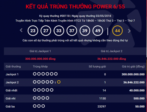 Tại kỳ quay thưởng thứ 118 số Power 6/55 mở thưởng ngày 3/5 đã kết thúc mà không thể tìm ra chủ nhân của giải Jackpot 1 trị giá 300.000.000.000 đồng.