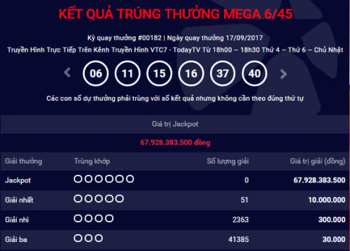 Trước đó, tại kỳ quay thưởng thứ 182 của Xổ số Mega 6/45 mởi thưởng ngày 17/9 đã không thể tìm ra chủ nhân của giải Jackpot trị giá 67.928.383.500 đồng.