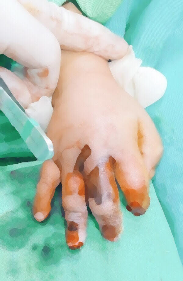 Ngày 5/5, khoa Chấn Thương- Chỉnh hình – Bỏng, bệnh viện Sản Nhi Nghệ An tiếp nhận trường hợp bệnh nhân Tr. Q.N ( 4 tuổi, trú tại Thị xã Hoàng Mai) nhập viện trong tình trạng đau đớn, chảy máu nhiều, sưng nề toàn bộ bàn tay phải, da bong tróc, hoại tử, dập nát đốt tay.