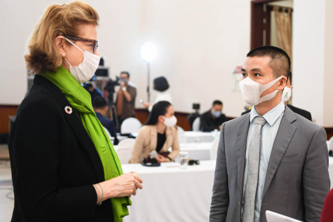 Bà Caitlin Wiesen, Trưởng đại diện thường trú UNDP tại Việt Nam và ông Phạm Tuấn Anh - Tổng biên tập Báo Dân trí trao đổi tại buổi lễ.