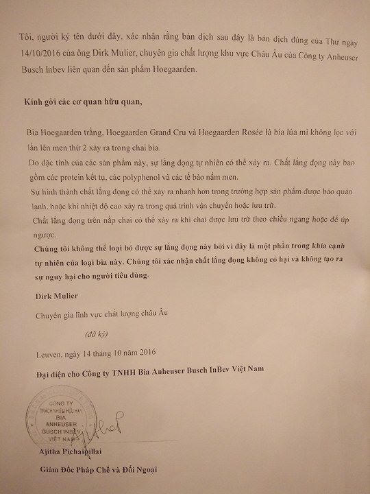 Câu trả lời này là của chuyên gia chất lượng khu vực Châu Âu của chính Công ty Anheuser-Busch INBEV được ký phát hành vào ngày 14/10/2016, trước 1 năm so với thời điểm sự việc xảy ra và được chính nhà phân phối xác nhận. Câu trả lời cũng chỉ được thể hiện bằng văn bản đơn thuần, không có bất kì tài liệu, cơ sở nào để kiểm nghiệm và đánh giá.