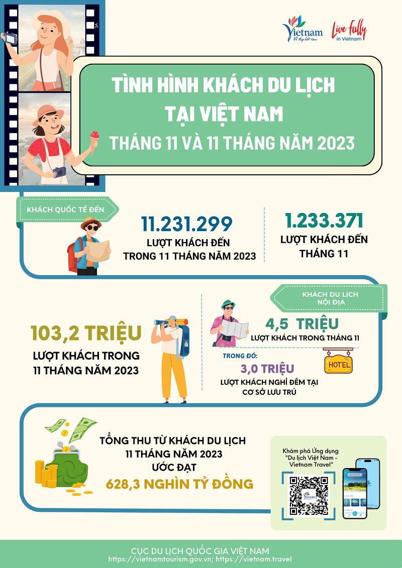 Lượng khách du lịch nội địa tháng 11 ước đạt 4,5 triệu lượt, trong đó có khoảng 3 triệu lượt khách có lưu trú. Tổng lượng khách 11 tháng đầu năm đạt 103,2 triệu lượt. Tổng thu từ khách du lịch 11 tháng năm 2023 ước đạt 628,3 nghìn tỷ đồng.