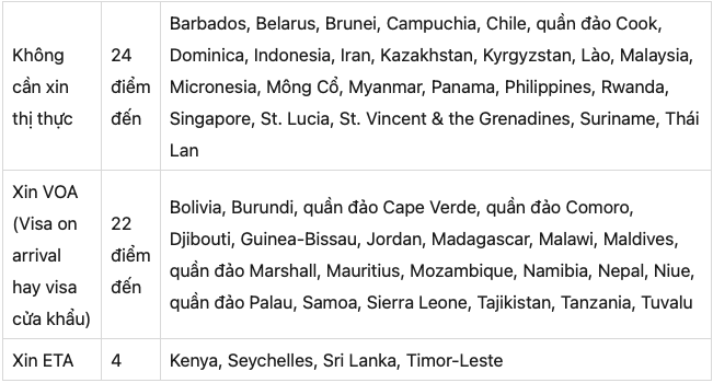 Công dân Việt hiện có thể nhập cảnh 50 điểm đến mà không cần visa hoặc chỉ cần xin e-visa, visa cửa khẩu, ETA (giấy phép du lịch điện tử) khi đi du lịch (không tính các loại visa du học, định cư dài hạn hay lao động). Hộ chiếu xếp hạng là hộ chiếu phổ thông (không tính hộ chiếu công vụ).