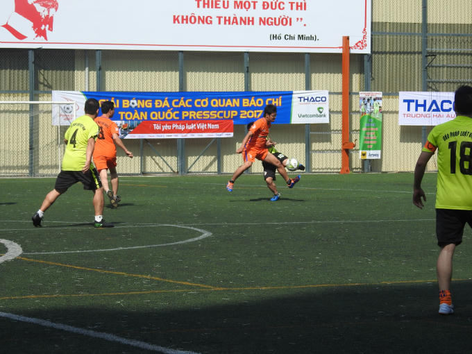 5': Với nhiều cơ hội tạo ra nhưng không thể chuyển hóa thành bàn thắng, đến phút thứ 5 nhận được đường chuyền của đồng đội Xuân Hồng đã khống chế và dứt điểm thành công, giúp báo Pháp luật Việt Nam vươn lên dẫn trước.