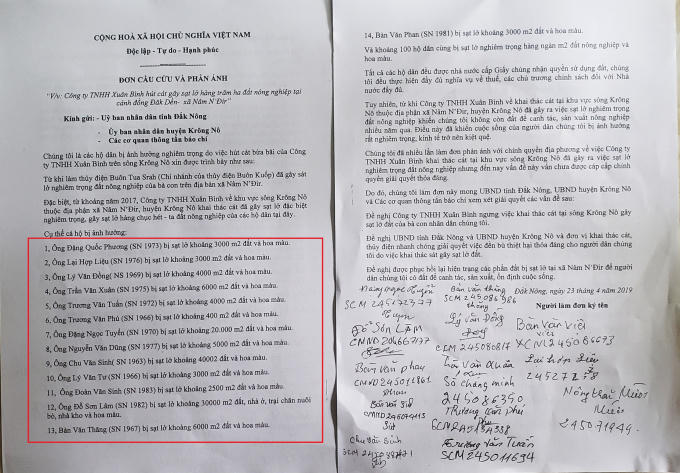 “Từ khi Công ty TNHH Xuân Bình về khai thác cát tại khu vực sông Krông Nô thuộc địa phận xã Nâm N’Đir, huyện Krông Nô đã gây ra việc sạt lở nghiêm trọng đất nông nghiệp khiến chúng tôi không còn đất để canh tác, sản xuất nông nghiệp nhiều năm qua. Điều này đã khiến cuộc sống của người dân chúng tôi bị ảnh hưởng rất nghiêm trọng, kinh tế trở nên kiệt quệ”, đơn phản ánh nêu rõ.