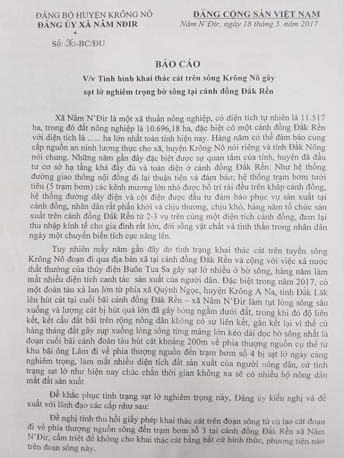 Với tình hình sạt lở trên, trước đó, Đảng ủy xã Nâm N’Đir cũng đã có Báo cáo số 96-BC/ĐU ngày 18/5/2017, về tình hình khai thác cát trên sông Krông Nô. Báo cáo này nêu rõ: “Mấy năm gần đây do tình trạng khai thác cát trên tuyến sông Krông Nô đoạn chảy qua địa bàn xã tại cánh đồng Đắk Rền và cộng với việc xả nước thất thường của thủy điện Buôn Tua Srah gây sạt lở nhiều ở bờ sông, hàng năm làm giảm diện tích canh tác sản xuất của người dân.
