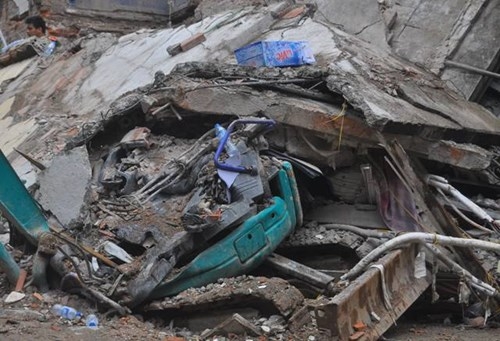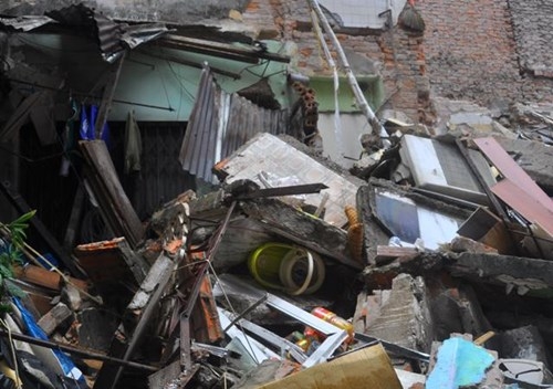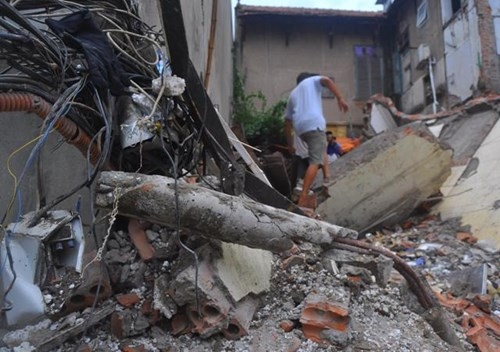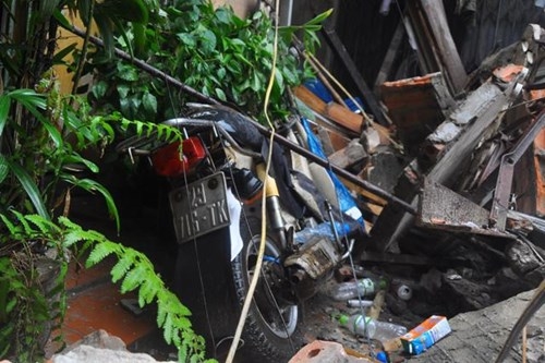 Theo ghi nhận của PV, ngôi nhà này sụp đổ hoàn toàn. Tường, sàn các tầng vỡ vụn từng mảng vùi lấp toàn bộ vật dụng bên trong.