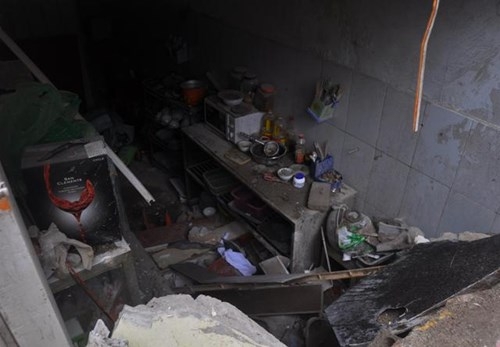 Gian bếp hộ kế bên sát ngôi nhà 3 tầng sập mất một góc tường, cát bụi bủa vây khu vực này.
