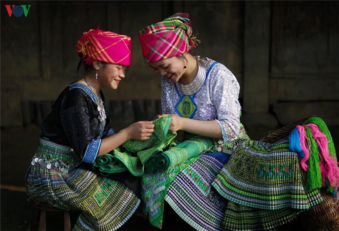 Chị em phụ nữ chăm chú thêu thùa may vá...