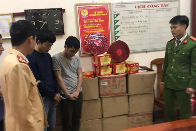 Trước đó, vào khoảng 23h40’ ngày 26/11, trong lúc tuần tra trên tuyến Quốc lộ 1A đoạn qua địa bàn xã Diễn Thịnh, huyện Diễn Châu, Nghệ An, đội tuần tra kiểm soát Trạm CSGT Diễn Châu phát hiện xe ô tô 7 chỗ mang BKS: 37A – 403.82 do Nguyễn Đức Thống (SN 1994, trú tại xã Cát Văn, huyện Thanh Chương) điều khiển và đối tượng Hoàng Võ (SN 1989, trú tại xã Diễn Thành, Diễn Châu) cùng đi trên xe. Tiến hành kiểm tra chiếc xe, tổ công tác phát hiện 15 thùng cát tông bên trong chứa 117 bánh pháo có trọng lượng gần 250 kg.