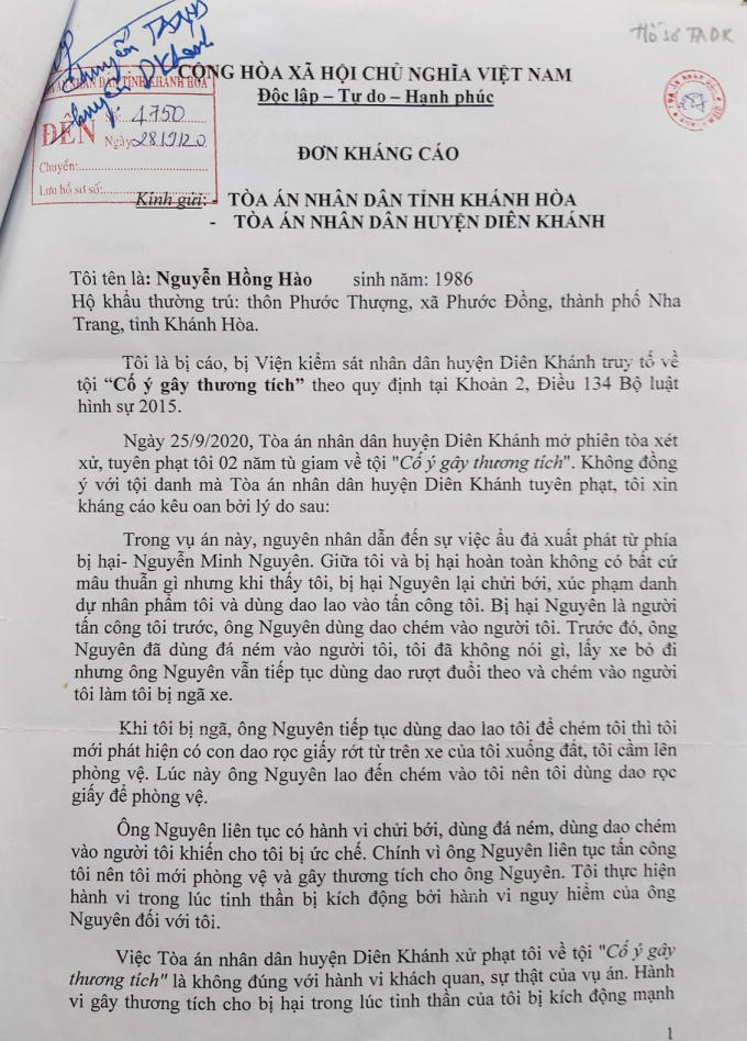 Không đồng ý với tội danh mà Tòa án nhân dân huyện Diên Khánh tuyên phạt đối với mình, anh Nguyễn Hồng Hào đã gửi đơn kháng cáo kêu oan.