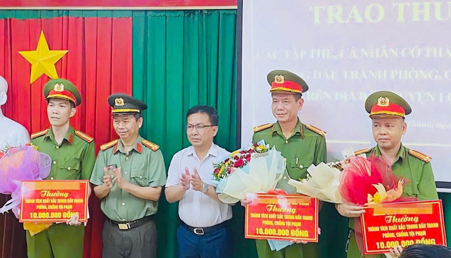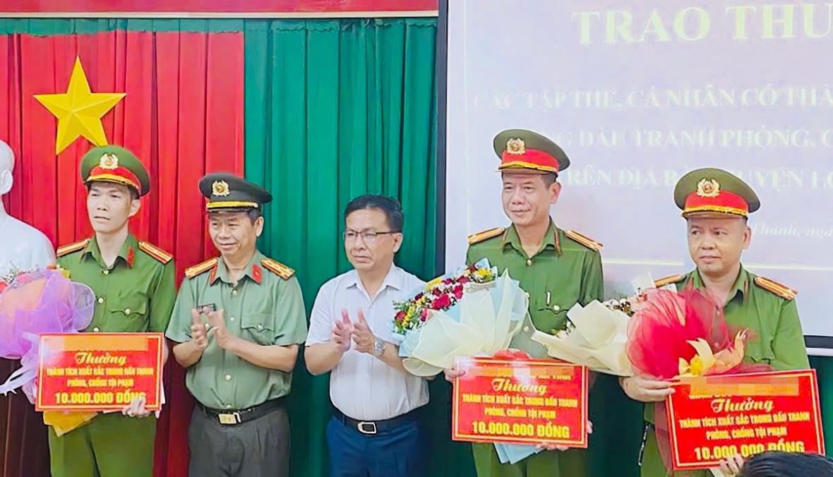 Thừa ủy quyền Chủ tịch UBND tỉnh Đồng Nai, đại tá Trần Tiến Đạt, Phó giám đốc Công an tỉnh Đồng Nai vừa trao thưởng cho đại diện các tập thể thuộc Công an huyện Long Thành tham gia phá vụ bắt nhóm đối tượng đột nhập trộm cắp nhiều tài sản có giá trị của người dân.