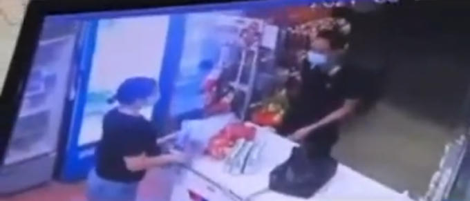 Camera quán tạp hóa tại thời điểm thanh niên F0 nhảy ra khỏi khu cách ly mua đồ ăn vặt cho nhóm bạn gái.