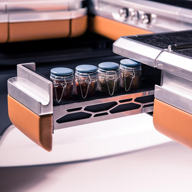 Các tính năng độc đáo tiếp theo trên chiếc Land Rover Discovery tích hợp nhà bếp này gồm có máy nướng bánh mì tích hợp ở bảng điều khiển trung tâm và khay đựng các hộp mứt ở ngay sau hệ thống điều hòa. Không dừng lại ở đó, Discovery còn có thể được trang bị một khu vườn thảo mộc, một bộ đồ gia vị và một bếp trượt cùng bếp ga đôi, bồn rửa, bàn ăn và TV 40 inch phía sau.