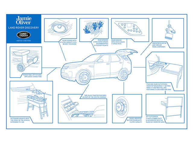 Đầu bếp Jamie Oliver chia sẻ rằng “Tôi đặt ra cho Land Rover một thách thức to lớn là tạo ra một căn bếp tuyệt vời nhất trong chính một chiếc xe hơi. Tôi đã đưa ra nhiều yêu cầu nghiêm ngặt và những gì họ tạo ra quả thật vượt sức tưởng tượng của tôi…”