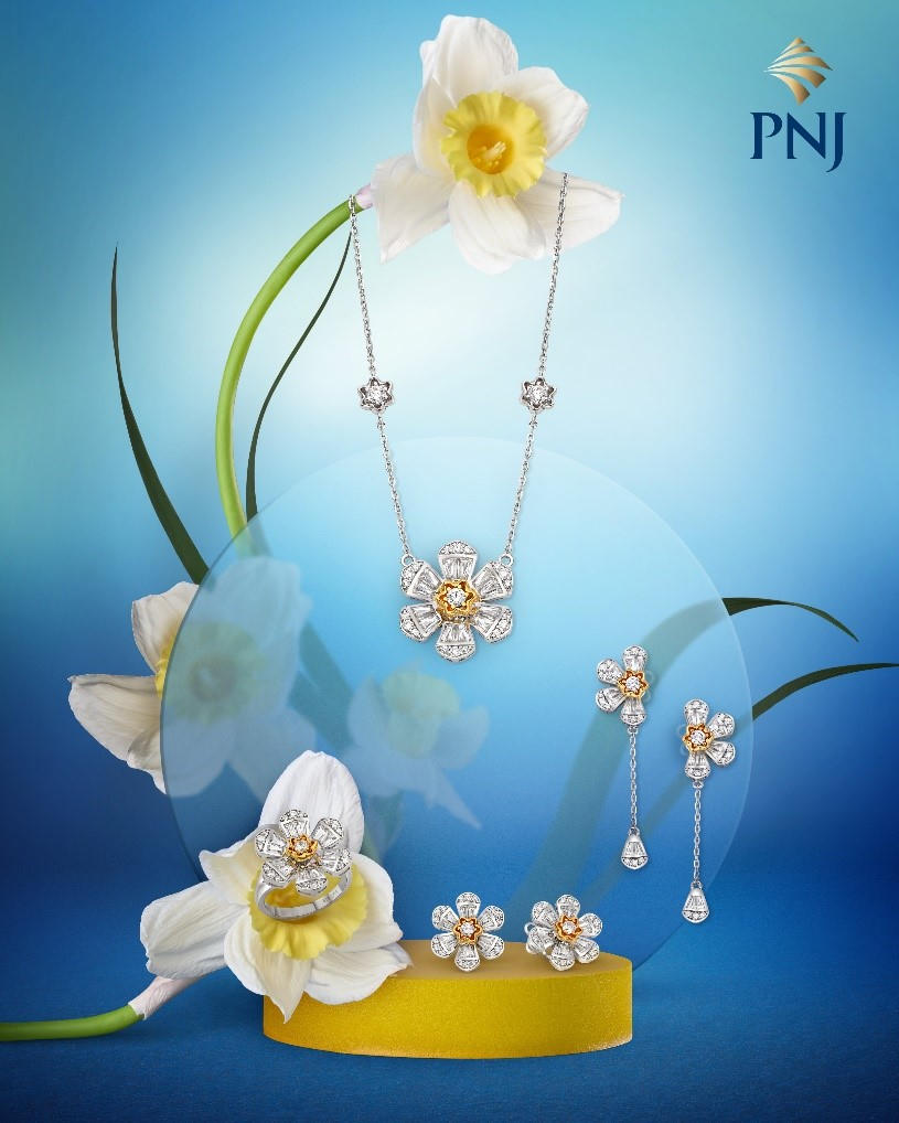 Dịp 8/3 năm nay, PNJ đặc biệt sáng tạo Bộ Sưu tập EUPHORIA – NHỮNG ĐÓA HOA ĐA SẮC. với hình tượng 2 loài hoa mang ý nghĩa đặc biệt. Hoa thủy tiên là biểu tượng cho sự giản đơn, bình dị và chân thành của người phụ nữ thương yêu. Hoa Lưu ly, còn có tên “Forget Me Not” với màu xanh tím, tượng trưng cho tình cảm nhẹ nhàng, ngọt ngào và lãng mạn.