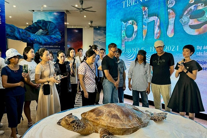 | Khách tham quan tại triển lãm nghệ thuật chăm chú nghe chia sẻ về nguy cơ tuyệt chủng của rùa biển. (Ảnh: PV) |