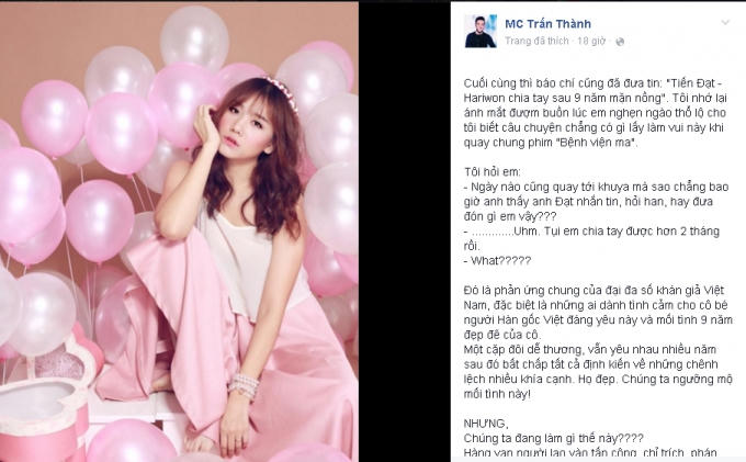 Còn đối với danh hài Trấn Thành, chia sẻ trên trang cá nhân về vụ ồn ào chia tay của Hari Won và Tiến Đạt, anh cho biết mình đã biết tin này từ lúc họ chia tay được 2 tháng. Hari đã tâm sự với anh khi quay chung phim “Bệnh viện ma”.