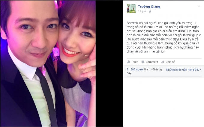 Chia sẻ trên trang cá nhân, Trường Giang cho biết trong showbiz, Hari Won là một trong 2 người con gái mà anh yêu thương nhất. Anh đã từng trải qua cảm giác giống của Har Won nên càng thương cô hơn.