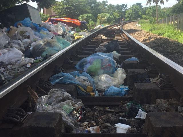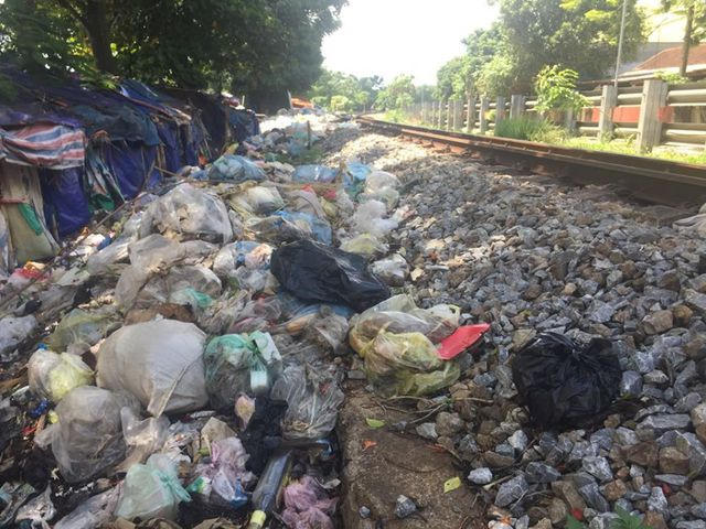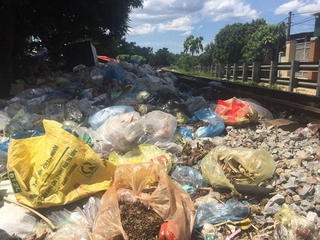 Ghi nhận của PV Dân trí, dọc đường mòn Hồ Chí Minh đoạn qua thị trấn Hương Khê, khu vực chợ Sơn rác chất thành đống khổng lồ. Thậm chí rác còn được vứt ngay cả trên đường tàu.