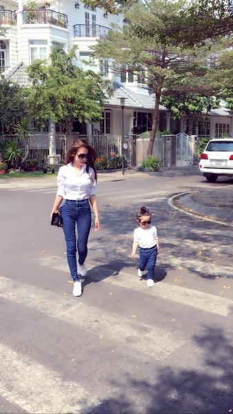 Trong những bức ảnh này, Cadie Mộc Trà trông vô cùng sành điệu và tinh nghịch khi đi học về cùng mẹ. Cô bé diện chiếc áo trắng và quần jeans màu xanh, đi giày thể thao cùng tông màu với mẹ Elly Trần.