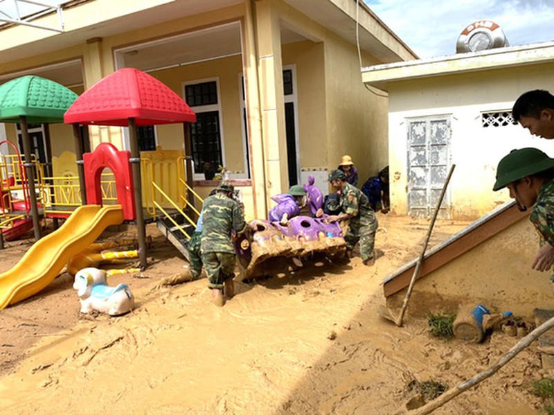 Đồn Biên phòng Hướng Lập hỗ trợ các giáo viên Trường Mầm non Hướng Việt dọn dẹp trường sau mưa lũ.