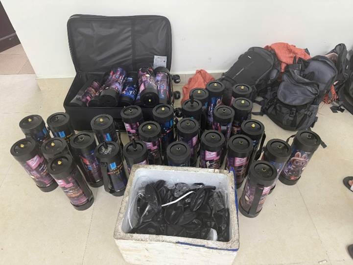 Tại thời điểm kiểm tra, cơ sở có 73 nhân viên và 58 khách, trong đó có 36 khách đang sử dụng bóng cười. Cơ quan Công an đã thu giữ 28 bình khí cười (N2O), 12 vỏ bình, cùng nhiều vỏ bóng đã qua sử dụng.
