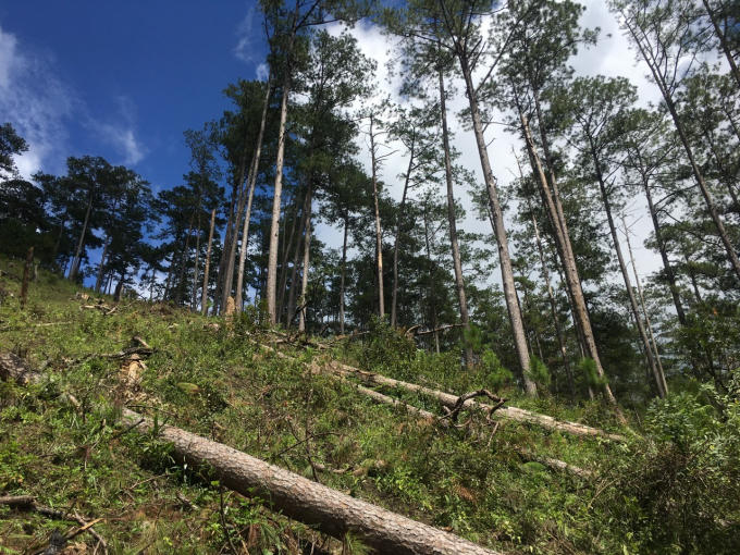 Nhiều cây thông bị triệt hạ, nằm ngổn ngang trong rừng.