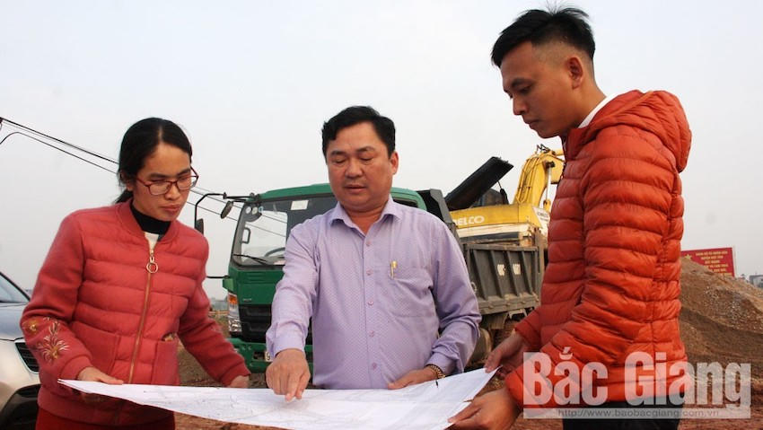Chủ tịch UBND thị trấn Bích Động Nguyễn Văn Quang (giữa), trao đổi với cán bộ về công tác giải phóng mặt bằng khu dân cư Đông Bắc. (ảnh Báo Bắc Giang)