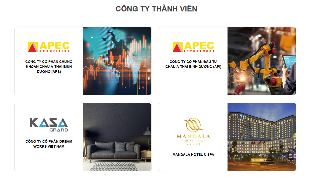 Công ty cổ phần Đầu tư châu Á - Thái Bình Dương (Mã HNX: API) và Công ty cổ phần Chứng khoán châu Á - Thái Bình Dương (Mã HNX: APS) là 2 công ty thành viên thuộc Apec Group.